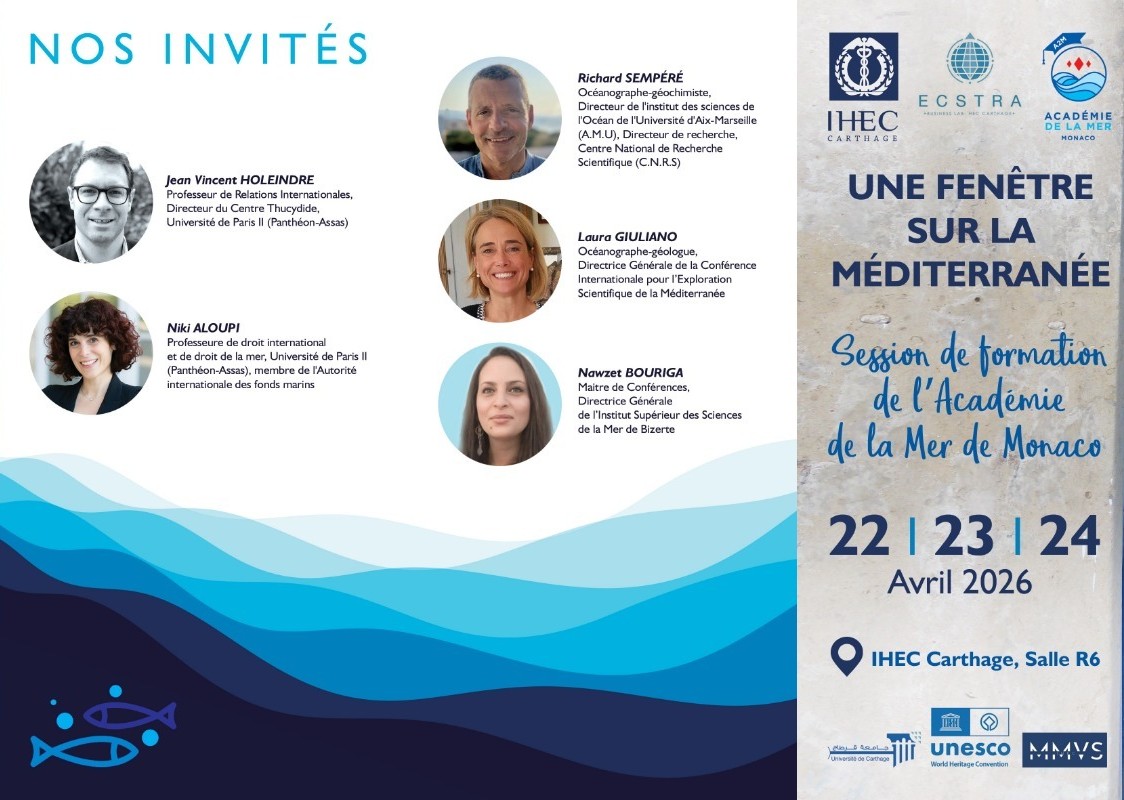 L’Académie de la Mer de Monaco est heureuse d’annoncer la tenue, du 22 au 24 avril prochain, d’une session de formation, organisée en Tunisie, en collaboration avec l’Institut des Hautes Études Commerciales de Carthage qui accueillera l’événement. Durant cette session, une trentaine d’auditrices et d’auditeurs pourront recevoir, en langue française, des enseignements interdisciplinaires relatifs aux […]